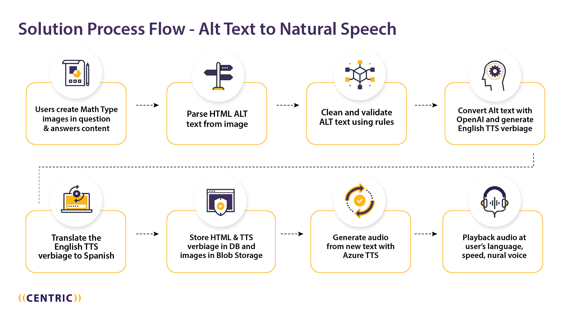 Process flow diagram of how our team used Wiris Mathype, OpenAI, and Microsoft Azure Cognitive Services to work together to translate images into readable HTML text and parse that ALT text into natural, accurate math verbiage for audio playback.
