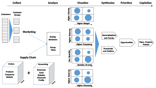 This new data describes particular attributes of the customer (for example, large vs. small, working within a particular market segment or across markets, serving a particular geography or national, intermediary, etc.). By connecting this information to operational data, a powerful linkage between what a customer is with how he behaves (order size, order frequency, market basket, rate of payment, etc.) can be created. In this way, marketing and operations can come together to better understand and group customers based on a set of similar attributes. These actionable insights can be leveraged to grow revenues and profits by identifying underserved customers and markets, as well as product and service gaps.