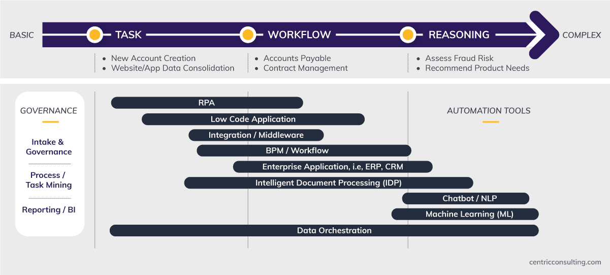 When implemented strategically, enterprise automation helps fill the gaps between these siloed systems. The most robust enterprise automation frameworks are built by integrating Robotic Process Automation (RPA), Business Process Management (BPM) and Artificial Intelligence (AI) capabilities.